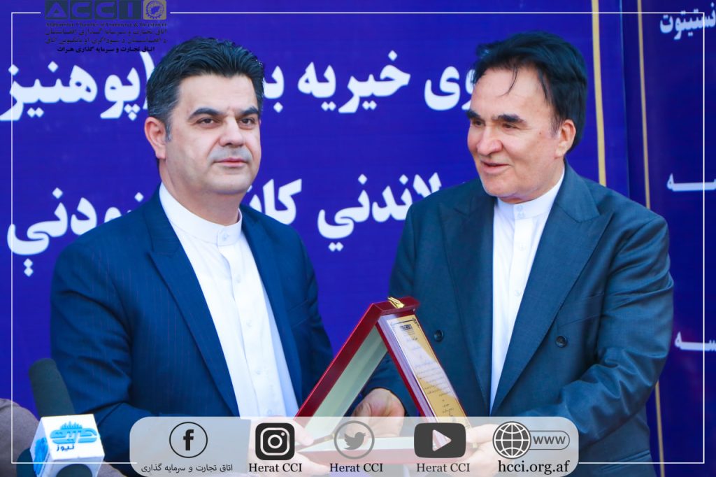 در اخیر این برنامه محترم محمد یونس قاضیزاده رئیس اتاق تجارت و سرمایه گذاری ولایت هرات لوح تقدیری را به پاس ارج گذاری به تمامی خدمات محترم الحاج احمد شاه فقیری موسس بنیاد خیریه فقیری در حوزه های مختلف کمک رسانی به مردم اهدا نمودند.