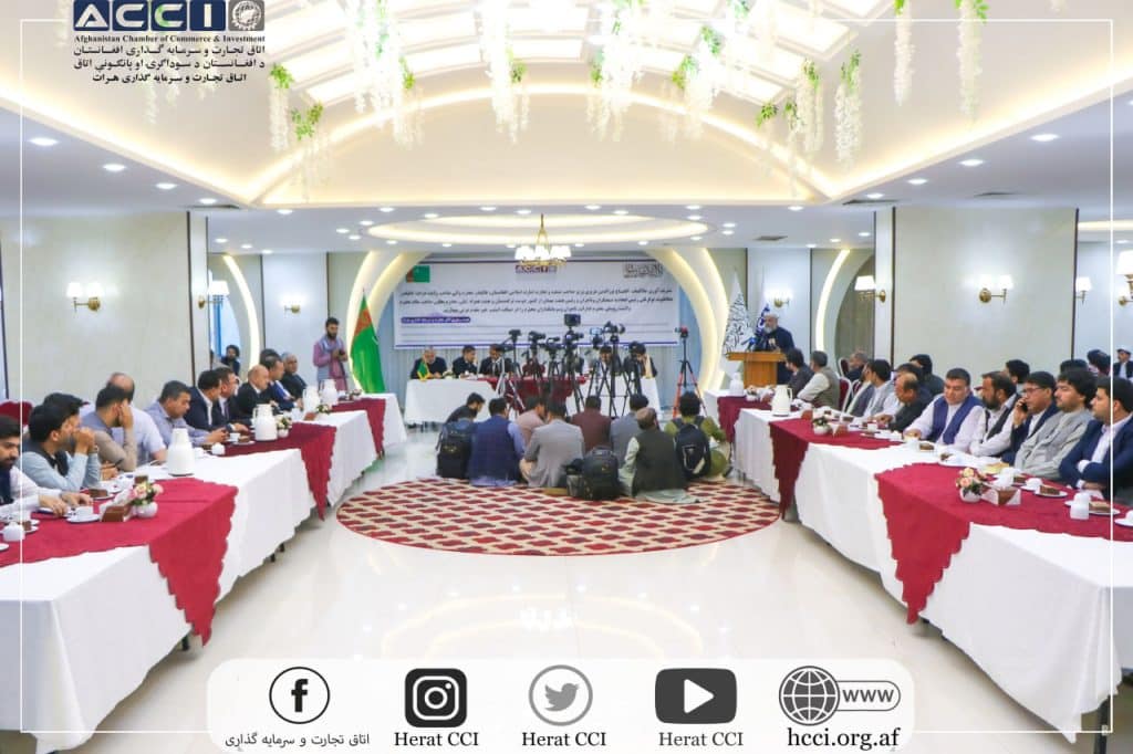 مراسم امضاء بیش از ده قرارداد و دو تفاهمنامه تجارتی میان افغانستان و ترکمنستان با حضور جلالتمآب الحاج نورالدین عزیز وزیر محترم صنعت و تجارت افغانستان، شیخ الحدیث والتفسیر الحاج مولانا نوراحمد اسلام جار والی محترم ولایت هرات، هیات محترم رهبری اتاق تجارت و سرمایه گذاری ولایت هرات، روسای محترم اداره محلی ولایت هرات، تاجران، سرمایه گذاران و صنعت کاران این ولایت.